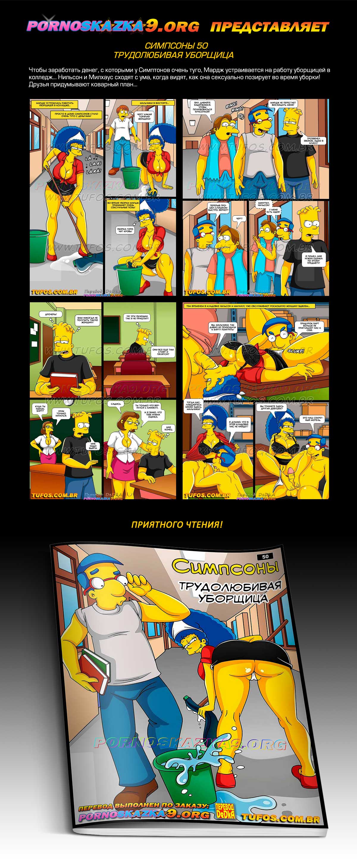 Порно комикс «Симпсоны. Часть 50. Трудолюбивая уборщица.» Чтобы заработать денег, с которыми у Симптонов очень туго, Мардж устраивается на работу уборщицей в колледж… Нильсон и Милхаус сходят с ума, когда видят, как она сексуально позирует во время уборки! Друзья придумывают коварный план…